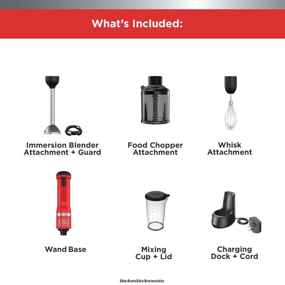 - Zusätzliche Artikel enthalten: rote Stabbasis, Mixbecher mit Deckel, Ladestation + Kabel, Stabmixerschutz