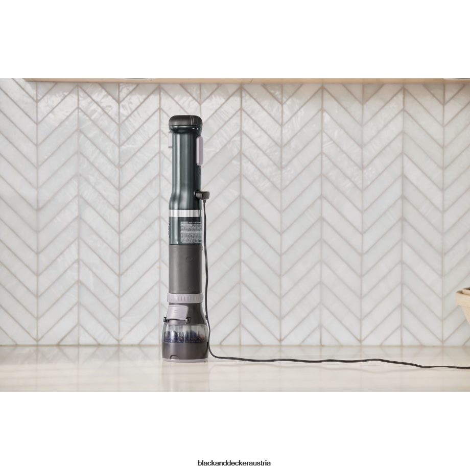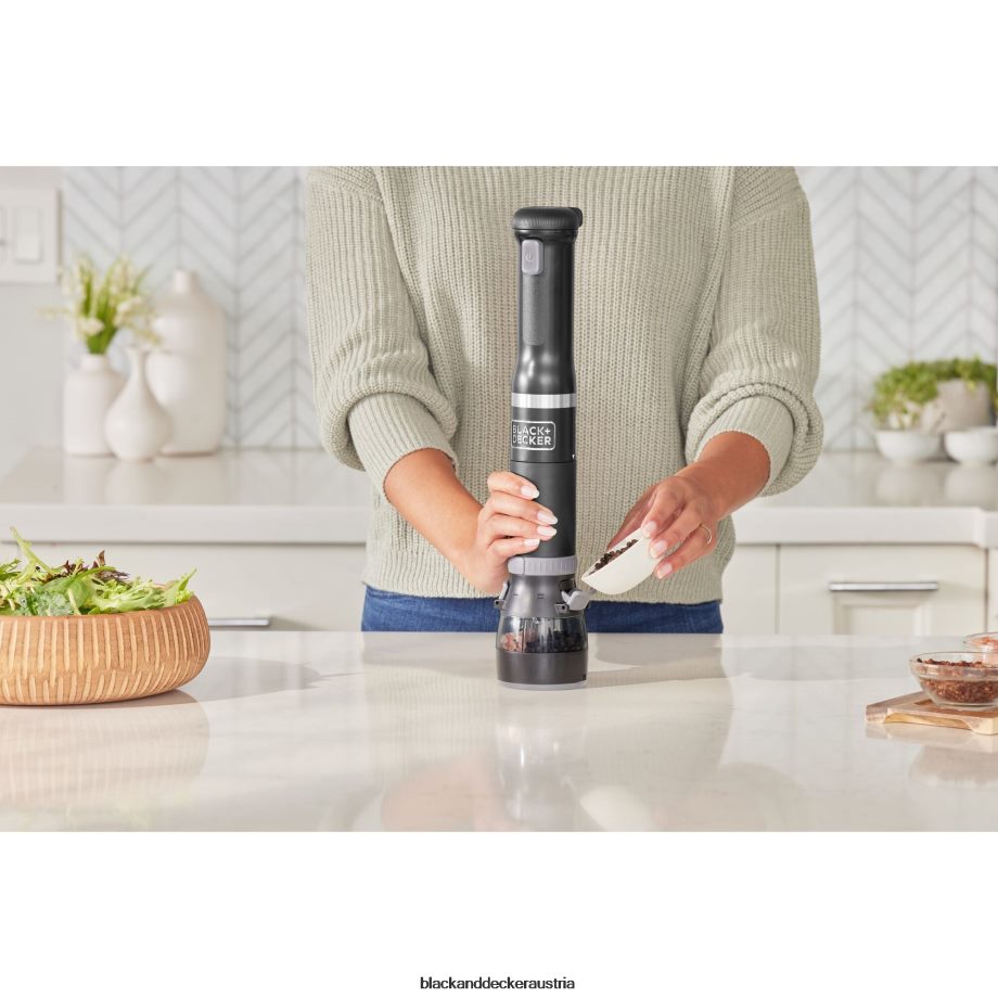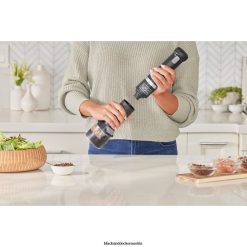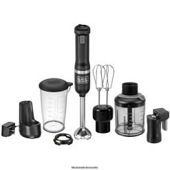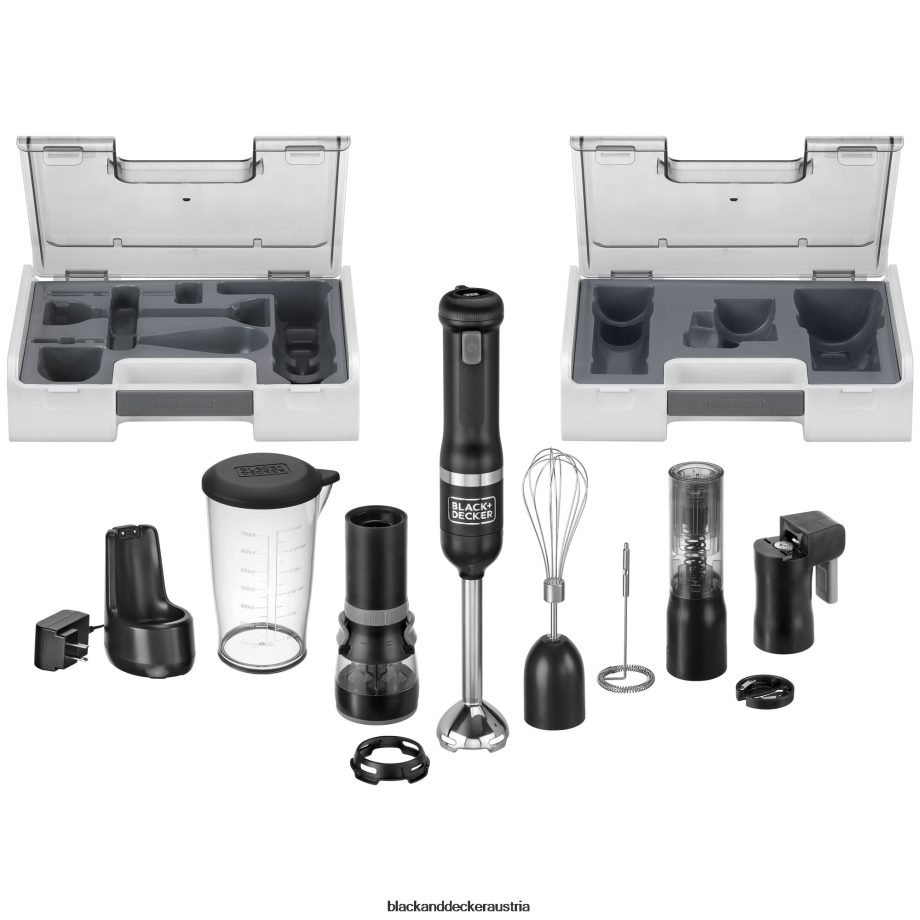 schwarze Zauberstabbasis. Stabmixeraufsatz. Stabmixerschutz. Schneebesenaufsatz. Milchaufschäumeraufsatz. Weinöffneraufsatz mit Folienschneider. Gewürzmühle attacVerpackung mit Deckel. Stabmixeraufsatz. Schneebesenaufsatz. Milchaufschäumeraufsatz. Dosenöffneraufsatz. Aufbewahrungskoffer mit Tabletteinsatz. Ladestation mit Kabel. Messbecher mit Deckel