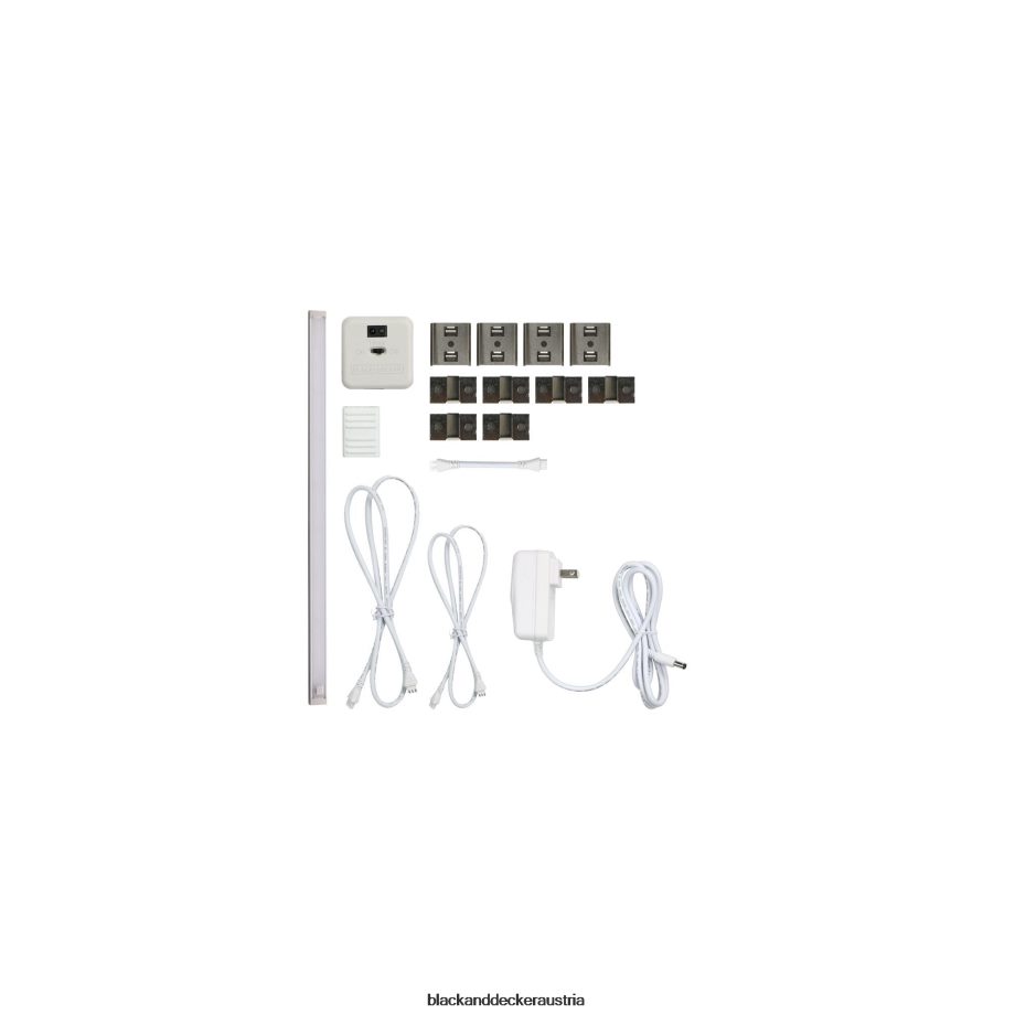 LED-Lichtleiste (Einschalttaste). Kontrollkasten. Netzteil. (4) Stangenbefestigungsclips. (6) Kabelbefestigungsklammern. (2) Befestigungsschrauben. Jumper-Extender. 4-Zoll-Überbrückungskabel. 12-Zoll-Überbrückungskabel. 30-Zoll-Überbrückungskabel