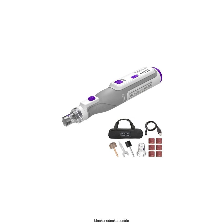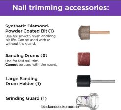 (1) 8 V max. Haustier-Nagelschleifer. (1) Aufbewahrungstasche. (1) Micro-USB-Ladekabel. (1) klarer Schleifschutz. (1) mit synthetischem Diamantpulver beschichteter Bohrer. (6) Schleifwalzen. (1) großer Schleiftrommelhalter. (1) Schraubenschlüssel