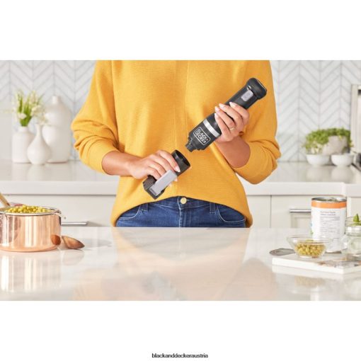 schwarze Zauberstabbasis. Stabmixeraufsatz. Stabmixerschutz. Schneebesenaufsatz. Milchaufschäumeraufsatz. Weinöffneraufsatz mit Folienschneider. Gewürzmühle attacVerpackung mit Deckel. Stabmixeraufsatz. Schneebesenaufsatz. Milchaufschäumeraufsatz. Dosenöffneraufsatz. Aufbewahrungskoffer mit Tabletteinsatz. Ladestation mit Kabel. Messbecher mit Deckel
