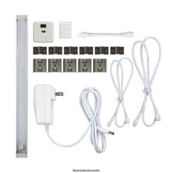 LED-Lichtleiste (Einschaltknopf). Kontrollkasten. Netzteil. (4) Stangenbefestigungsclips. (6) Kabelbefestigungsklammern. (2) Befestigungsschrauben. Jumper-Extender. 4-Zoll-Überbrückungskabel. 12-Zoll-Überbrückungskabel. 30-Zoll-Überbrückungskabel