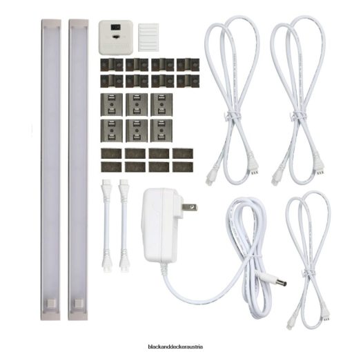 (2) LED-Lichtleiste (Einschalttaste). Kontrollkasten. Netzteil. (6) Stangenbefestigungsclips. (8) magnetische Befestigungsclips. (8) Kabelbefestigungsklammern. (4) Befestigungsschrauben. Jumper-Extender. (2) 4-Zoll-Überbrückungskabel. 12-Zoll-Überbrückungskabel. (2) 30-Zoll-Überbrückungskabel